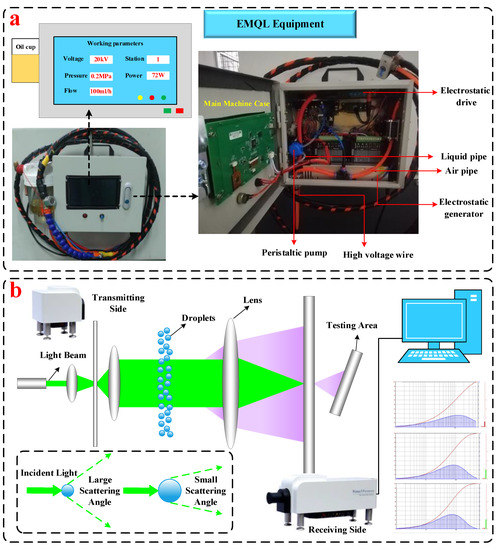 Experimental device for evaluating atomization performance. (a) schematic diagram of EMQL Equipment, (b) schematic diagram of VAD value acquisition.