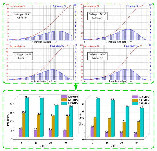 Considering the environmental damage and threats to the health of operators caused by the migration and dispersion of tiny oil mist particles during the atomization process, the PM2.5 and PM10 percentage concentrations were also measured under different gas pressure and voltage conditions during the observation of droplet group distribution. As the gas pressure increases, the concentrations of PM2.5 and PM10 significantly increase. It is believed that the increase in gas pressure leads to more intense energy exchange between the gas and liquid phases, increasing the probability of small liquid droplet breakage. During breakage, extremely small droplets are produced. The addition of an electric field has a noticeable inhibitory effect on the concentrations of PM2.5 and PM10. As the voltage increases, the overall trend of PM2.5 and PM10 concentrations decreases continuously. Under the three gas pressure conditions, the PM10 percentage concentrations at 40 kV working conditions decreased by 19.05%, 14.39%, and 23.15% compared to pure aerodynamic atomization, respectively. At 40 kV working conditions, the PM2.5 percentage concentrations decreased by 64.29%, 22.22%, and 25.93% compared to the pure aerodynamic atomization working conditions, respectively.
