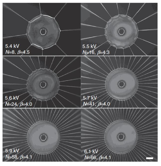 - Wang, Z.; Tian, Y.; Zhang, C.; Wang, Y.; Deng, W. Massively Multiplexed Electrohydrodynamic Tip Streaming from a Thin Disc. Phys. Rev. Lett. 2021, 126, 064502. [Google Scholar] [CrossRef] [PubMed]