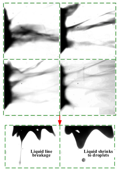 The liquid atomization is stretched by the external force to form multiple jets, and in the pure pneumatic atomization process, the unstable gas trajectory is likely to cause uneven distribution of liquid film and produce very fine liquid lines [31], as shown in Figure 9. The distribution of the liquid film is more uniform after charging, which reduces the probability of fine lines, and the surface tension of the liquid is reduced after adding the electric field, which reduces the retraction speed when the liquid line breaks and reduces the possibility of satellite droplets, thus effectively reducing the concentration of fine particles in the atomization process. Under the same voltage conditions, the concentration of PM2.5 and PM10 increases significantly with the increase of air pressure, and the increase of air pressure will lead to a more intense energy exchange between the two phases of gas and liquid, the probability of breaking small liquid clusters increases, and the breaking will produce small droplets of very small particle size. In summary, the electrostatic field has a significant effect on particle size refinement, reducing the distribution width of droplet clusters and inhibiting the production of fine particles such as PM10 and PM2.5.