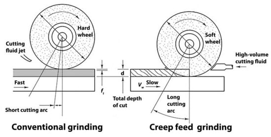 Graphical representation of conventional grinding vs. creep feed grinding.
