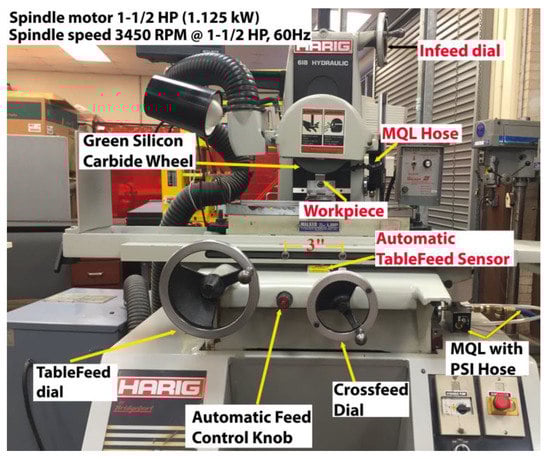 The experiments are conducted using a hydraulic surface grinder that is used by small industries and craftsmen (Figure 2). The behavior of hydraulic surface grinders is analogous to that of high-end industrial grinders; therefore, it will also provide a clear understanding of the parameters to creep feed grind Ti-6Al-4V at an industrial level. The study includes the thorough understanding of the capabilities of the hydraulic surface grinder to creep feed grind Ti-6Al-4V. The operational parameters of the MQL system were also studied and their effects weighed. The MQL machine was used to study the effects of creep feed grinding Ti-6Al-4V with an ester oil base nanofluid. Creep feed grinding Ti-6Al-4V using a flood lubrication machine was used to have comparable results with the MQL methods. A synthetic oil was used as the grinding coolant. The operational parameters of the flood lubrication system were also studied, and their effects weighed.