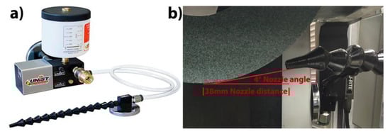 (a) Unist’s Minimum Quantity Lubrication device system, (b) MQL nozzle with optimum distance and angle displayed.