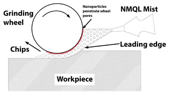 The nano-MQL (NMQL) design of experiments involve working with the developed γ-Al2O3 nanofluid. Selected parameters were based on our group research and previous research by Mahbubul et al. []. These parameters created a desirable nanofluid solution with properties that include higher thermal conductivity, lower viscosity, decrease in cluster size, and a higher density. The nanoparticle will penetrate the pores of the grinding wheel, creating a layer of nanostructures that have hydrophilic properties of contact angles below 90 degrees. This allows for the particle droplets to spread and attract themselves to the tool-work piece surfaces, creating a larger lubricated surface area (Figure 4).