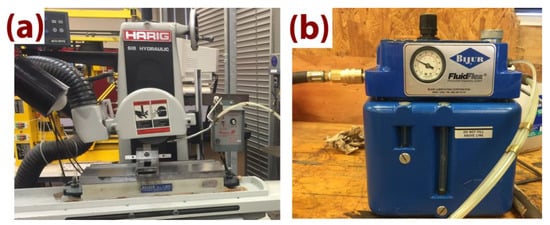 The hydraulic surface grinder (Figure 5a) worked with a flood lubrication machine shown in Figure 5b (Bijur Delimon’s FluidFlex Pressurized Flood System). It uses a water-soluble coolant containing 97% water and 3% PowerChip 2000 coolant. The synthetic grinding coolant contains the following chemicals: polyalkylene glycol, triethanolamine, boric acid, and monoethanolamine. The system has an integrated electrical motor that requires electricity and provides pressure. Upon preliminary tests, we found that a pressure of 414.685 kPa (60 PSI) provided desirable results and avoided excess coolant usage. Nozzle distance and angle were important to consider for lubrication tool-work piece penetration. An optimum distance of 38 mm from the tool-work interface and a nozzle angle of 4 degrees from the tool-work interface was used in the experiments.