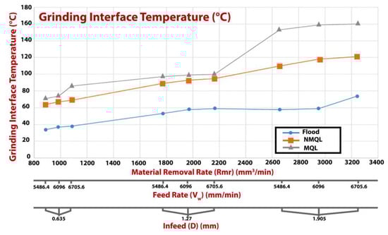 Table 2 represents the material removal rate, surface roughness across (Ra), surface roughness across (Rz), surface roughness along (Ra), surface roughness along (Rz), and grinding interface temperature for the evaluation performed. Using this data, line graphs were created to have a clearer understanding of the performance of the different grinding parameters using MQL, NMQL, and flood lubrications.
