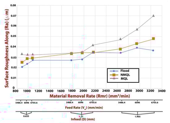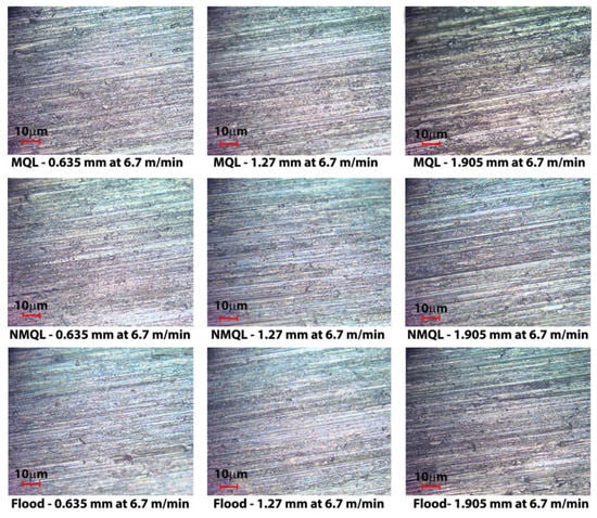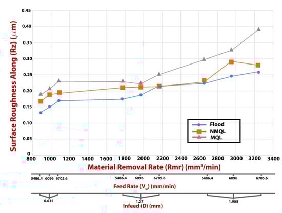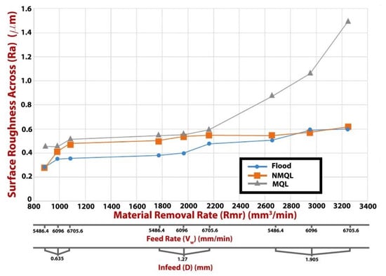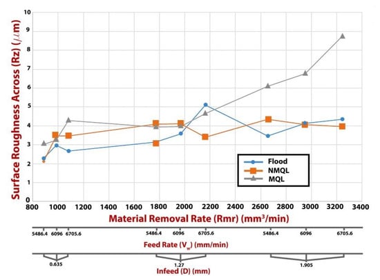 The Rz is known as the mean rough depth, which is the average distance between the highest peak and the deepest valley. The across value is perpendicular to the cut. MQL, NMQL, and flood showed similar performances at infeeds of 0.635 mm and 1.27 mm (Figure 8). Here, at an infeed of 1.905 mm, the flood and NMQL performed similarly; meanwhile, the MQL started to degrade in surface quality.