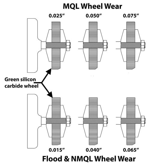 A comparative study of grinding wheel wear for different lubrication methods was conducted to find the lubrication methods that produce minimum wear in infeed grinding. Figure 11 represents the grinding wheel wear after the material removal of each sample at the corresponding grinding parameters.