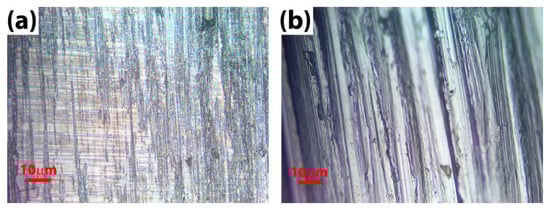 (a) Sand polished microscopic image at 20×, (b) Band saw cut microscopic image at 20×.