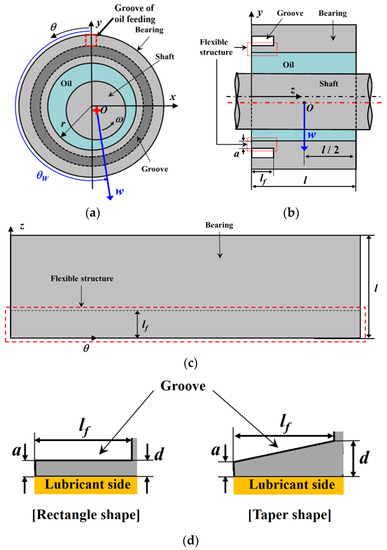 Schematics of the journal bearing system: (a) x–y plane; (b) y–z plane; (c) θ–z plane; (d) shapes of the flexible structure.