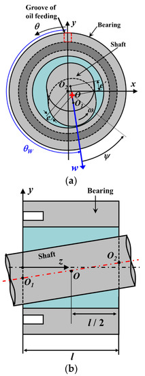 The oil film thickness h between the bearing and shaft should be obtained to calculate the oil film pressure in Equation (2). The shaft rotates the bearing with eccentric and tilted motions, as shown in Figure 3; O is the center of the shaft at the location where z is equal to l/2. O1, O2 are the centers of the shaft at both ends of the bearing, respectively. Two circles in Figure 3a are cross sections of the shaft projected onto the x–y plane, and O1, O2 are their centers. The eccentric amount, e, is a distance on the x–y plane between O and the center of the bearing. The attitude angle ψ is an angle on the x–y plane between the load direction and a straight line passing through O and the bearing center. The tilting direction of the shaft is equal to θW, and the tilting amount e’ is equal to half the distance between O1 and O2 on the x–y plane. When the tilting amount is equal to zero, the shaft rotates in the bearing under the aligned condition. The oil film thickness between the shaft and bearing is calculated using Equation (5).
