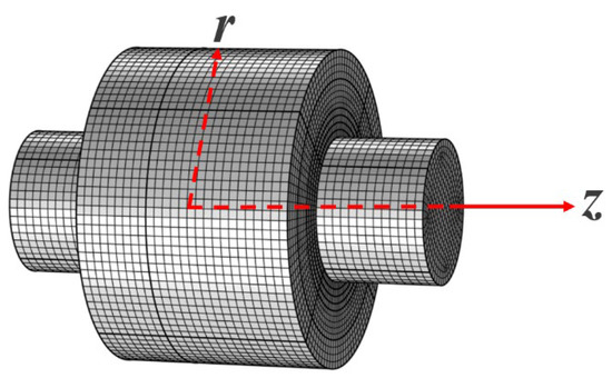 The parameters ε and ε’ in Equation (7) are the eccentricity and tilting ratios of the shaft, respectively. The oil film thickness changes with elastic deformation of the flexible structure, which should also be obtained to calculate Equation (5). The elastic deformation of the bearing is calculated using the solid mechanics module, and the numerical results are interworked with the hydrodynamic bearing module for hydrodynamic lubrication analysis. Figure 4 shows the hexahedral mesh of the finite element model. The hexahedral mesh is used for numerical calculations owing to its higher resolution and faster calculation in comparison to the tetrahedral mesh [26]. A mesh validation was performed, and the difference in the results’ values was less than 2%. In the analysis, 52 elements are applied in the circumferential direction, and 53 elements are applied in the axial direction, except in the groove region. In the groove region, 108 elements are applied in the circumferential direction. The total number of elements is thus 50,220. The value of the convergence criteria is given as 10−3 for continuity, velocity, and deformation.