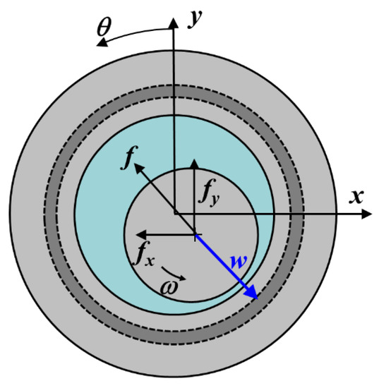 The oil film force fo is generated by the oil film pressure and is used to calculate the motion of the shaft by comparing with the load with the load. Figure 5 shows the oil film force acting on the shaft. The parameters fox, foy are components of the oil film force in the x, y directions and are calculated using Equations (10) and (11), respectively. The oil film force is calculated with Equation (12).