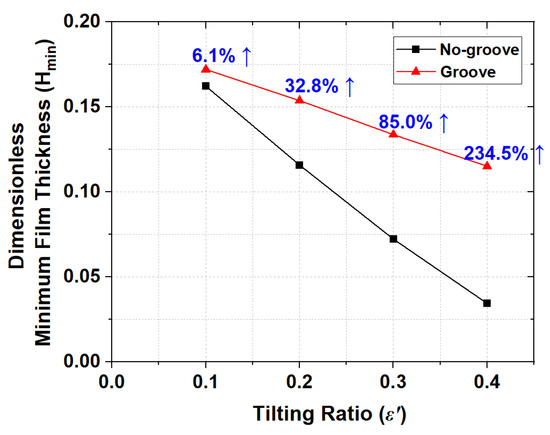 The main purpose of the flexible structure is to prevent contact at the misaligned journal bearing end. Therefore, the minimum film thicknesses required for various misalignments and flexible structure geometries need to be compared. First, the minimum film thicknesses for different tilting ratios are compared with those of the no-groove journal bearing under a constant flexible structure geometry, and these specifications are shown in Table 2. Figure 8 shows the dimensionless minimum film thickness (Hmin) with variation of the tilting ratio ε’. The dimensionless minimum film thickness decreases when the tilting ratio increases under a constant load. The no-groove journal bearing has a dimensionless minimum film thickness of about 0.03 when the tilting ratio is equal to 0.4. This value is 3% of the clearance and may cause metal-to-metal contact at the bearing end because the minimum film thickness is significantly small. The journal bearing with flexible structure obtains a larger dimensionless minimum film thickness owing to the increase in the film thickness due to elastic deformation as compared to the no-groove one. Moreover, the amount of increase in the dimensionless minimum film thickness due to the flexible structure is proportional to the tilting ratio. The dimensionless minimum film thickness of the bearing with flexible structure is about 2.3 times that of the no-groove one for the case where the tilting ratio is equal to 0.4.