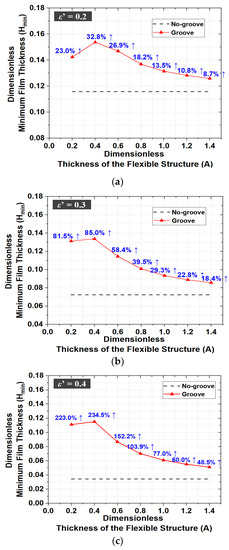 The appropriate dimensionless thickness of the flexible structure can be used to maximize the dimensionless minimum film thickness. Moreover, to obtain a larger film thickness, it is necessary to find an appropriate thickness of the flexible structure that can be used as a reference because the location of the minimum film thickness in the Z direction changes when the thickness of the flexible structure varies.