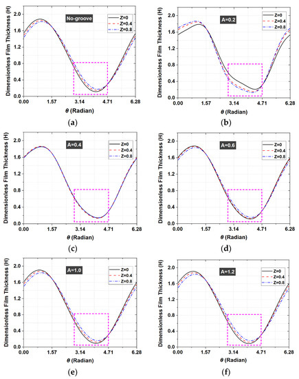 Circumferential distributions of the dimensionless film thickness for different A (L = 3.0, Lf = 1/3, W = 4.4, γ =1.0, ε’ = 0.3). (a) No-groove; (b) A = 0.2; (c) A = 0.4; (d) A = 0.6; (e) A = 1.0; (f) A = 1.2.