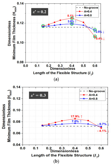 - As the dimensionless length of the flexible structure increases, the minimum film thickness increases up to a certain length and then decreases. The reason for this is that an appropriate length of the flexible structure is advantageous for obtaining the oil film thickness based on the elastic deformation region.
