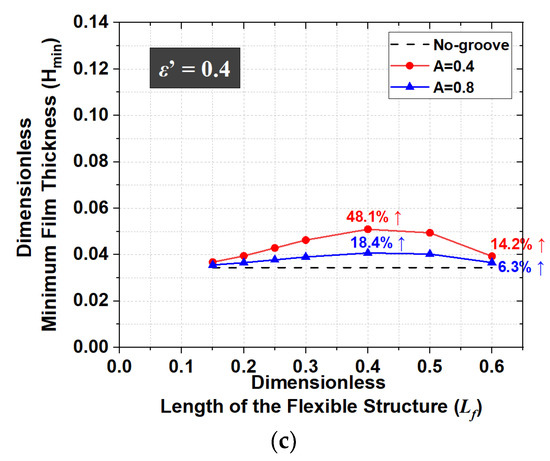 Dimensionless minimum film thickness with Lf (L = 3.0, W = 4.4, γ =1.0). (a) ε’ = 0.2; (b) ε’ = 0.3; (c) ε’ = 0.4.