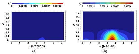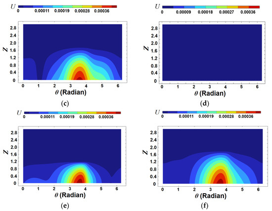 Distributions of the dimensionless deformation for ε’ = 0.2. (a) A = 0.4, Lf = 0.15; (b) A = 0.4, Lf = 0.4; (c) A = 0.4, Lf = 0.6; (d) A = 0.8, Lf = 0.15; (e) A = 0.8, Lf = 0.4; (f) A = 0.8, Lf = 0.6.
