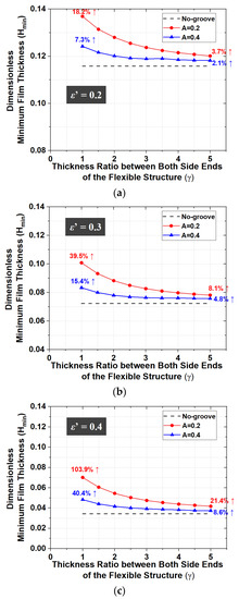 The dimensionless minimum film thickness is maximized when the film thickness distribution in the area that is flexible and where the oil film pressure is generated is almost constant along the axial direction. Then, the elastic deformation amount at the outer region of the flexible structure should be larger than that of the inner region for the misaligned journal bearing. Therefore, the analysis results for various cross-sectional shapes of the flexible structure are also estimated for the specifications shown in Table 5. The minimum film thicknesses for various thickness ratios of the flexible structure ends (γ) are compared with those of the no-groove journal bearing, and the results are shown in Figure 14.