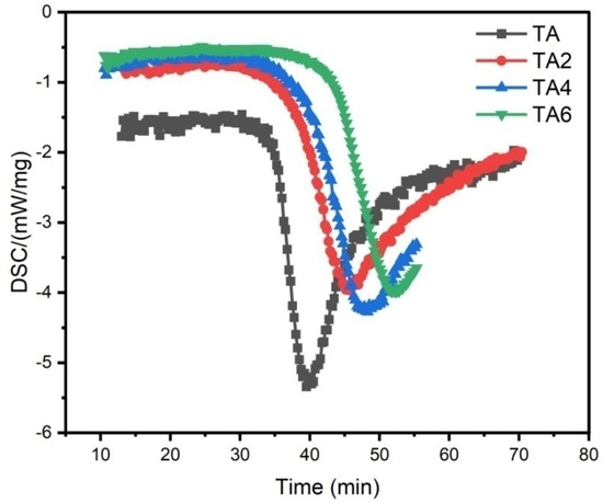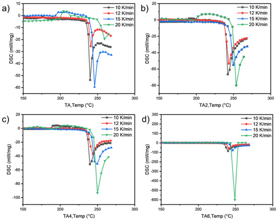 PDSC curves of (a) TA, (b) TA2, (c) TA4, and (d) TA6 at different heating rates.