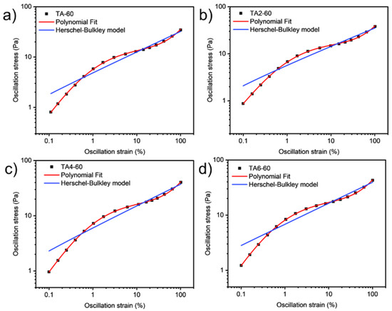 Oscillation strain dependence on stress of GRK-A for (a) TA, (b) TA2, (c) TA4, and (d) TA6 at 60 °C.