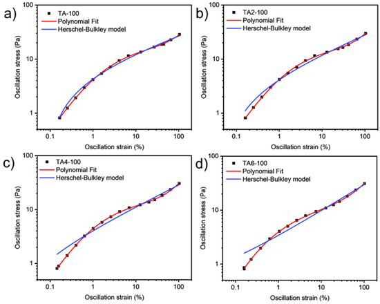 These data were not fitted to the Ostwald-de-Waele model (Equation (10)) because of R2. These presented a value of n not close to 1, as was expected for non-Newtonian fluids. The existence of a yield stress value can be recognized in Figure 9, Figure 10, Figure 11 and Figure 12, and the data were not satisfactorily fitted to a Herschel-Bulkley model (Equation (11)), and the results are collected in Table 12. The data were satisfactorily fitted to a polynomial model (Equation (12), R2 > 0.999), and the results are collected in Table 12.