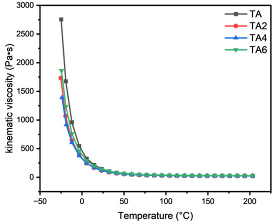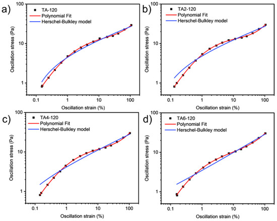 At the flow point, the strain amplitude γ is ordered as follows: 60 °C, γ (TA6) > γ (TA4) > γ (TA2) > γ (TA); 80 °C, γ (TA4) > γ (TA2) > γ (TA6) > γ (TA); 100 °C, γ (TA4) > γ (TA6) > γ (TA2) > γ (TA); 120 °C, γ (TA2) > γ (TA6) > γ (TA4) > γ (TA). The energy storage modulus, G′, is ordered as follows: 60 °C, G′ (TA2) > G′ (TA4) > G′ (TA) > G′ (TA6); 80 °C, G′ (TA) > G′ (TA6) > G′ (TA2) > G′ (TA4); 100 °C, G′ (TA) >G′ (TA2) > G′ (TA4) > G′ (TA6); and, at 120 °C, G′ (TA) > G′ (TA4) > G′ (TA2) > G′ (TA6). The shear stress, τf, is sorted as follows: 60 °C, τf (TA6) > τf (TA4) > τf (TA2) > τf (TA); 80 °C, τf (TA4) > τf (TA2) > τf (TA6) > τf (TA); and, at 100 °C, τf (TA4) > τf (TA2) > τf (TA6) > τf (TA); finally, at 120 °C, τf (TA2) > τf (TA4) > τf (TA6) > τf (TA).