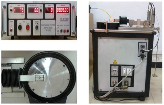 The dry sliding wear properties of the composite specimens were assessed using DUCOM pin-on-disc sliding wear testing equipment (Manufacturer: DUCOM, Bangalore, India) as shown in Figure 1. The dry sliding wear tests were carried out in accordance with ASTM G99-95 guidelines. Acetone was used to clean the pin, and a digital electronic balance was used to determine its initial mass. Afterward, during the test, the pin was kept placed against a rotating EN-32 steel disc (counter face) with a hardness of 65 HRC. Variations in the applied normal load, sliding speed, and sliding distance were made during the testing. Following acetone cleaning, the pin’s final mass was determined at the conclusion of each test. The pin’s mass loss from sliding wear was determined by the difference between its original and final masses. The pin’s associated density measurements were used to compute the volume loss due to wear. The composite pins’ wear rate was then determined.