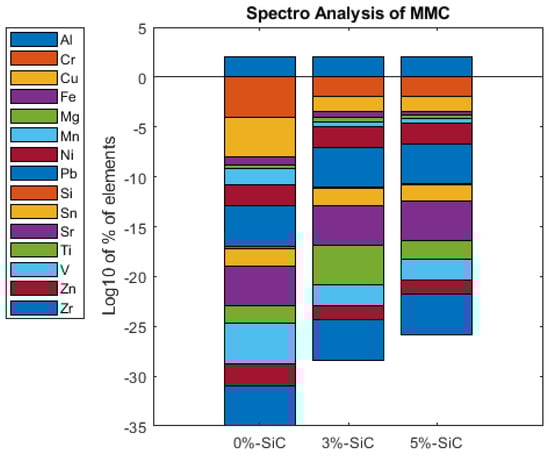 Minor elements such as chromium (Cr), copper (Cu), iron (Fe), magnesium (Mg), manganese (Mn), nickel (Ni), and zinc (Zn) also exhibited an increasing trend with the addition of SiC, with iron and manganese showing the most significant increase. This suggests that the introduction of SiC may have some influence on the dispersion of these minor elements within the composite.