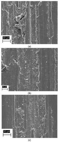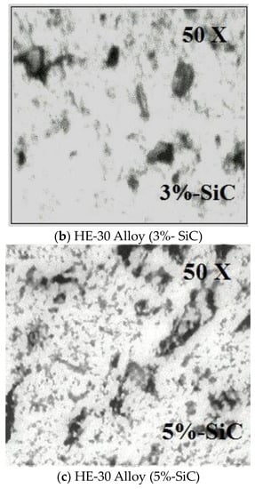 The presence of particles from wear debris indicates that both adhesive and abrasive wear have occurred during the wear test, causing the plastic shearing of surface irregularities. The SEM micrographs shown in Figure 6 also reveal areas of damage, potentially resulting in flake-shaped debris. When it comes to aluminum-based metal matrix composites (MMCs) that contain reinforcing phases such as SiC, the reinforcement material tends to act as a secondary abrasive against the opposing surface, thereby increasing wear on the counter face. Moreover, as the reinforcement material is released as wear debris, it acts as a third-body abrasive, affecting both the matrix and reinforcement surfaces. The matrix alloy’s worn surface exhibits more pronounced grooves, particularly in composites with lower volume fractions of SiC reinforcement. These grooves undergo severe plastic deformation, resulting in significant wear.