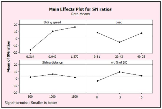 The most effective combination of factors and their respective amounts for producing the lowest wear rate can be identified by consulting the primary impact plots for the S/N ratio (Figure 4). The best configuration is determined to be A3B1C2D2, which corresponds to sliding speeds of 1.57 m/s at level 3, a load of 9.81 N at level 1, a sliding distance of 1000 m at level 2, and a SiC weight percentage of 5 wt% at level 2. It is anticipated that using these parameter settings will effectively reduce the wear rate.