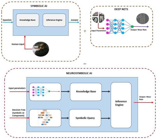 The framework of the implemented NSAI algorithm in present work is shown in Figure 7. The implementation of the neurosymbolic algorithm in this study involves an innovative coupling of a decision tree and a neural network, aiming to improve the predictive performance on the wear rates in aluminum–silicon carbide (Al/SiC) metal matrix composites (MMCs). In this application, the symbolic component of the neurosymbolic algorithm, represented by the decision tree, is utilized to logically structure and decipher the relationships and interactions between different variables that may influence the wear rates in MMCs, such as the varying weight percentages of SiC, compositional transformations, and spectroscopic analysis findings. This approach harnesses the interpretability and transparency of decision trees, which allows for a systematic breakdown of complex relationships in the data.