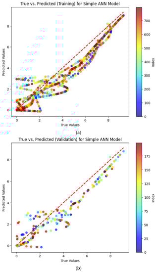 The plot obtained for simple ANN: (a) true vs. predicted values for training; (b) true vs. predicted values for validation.