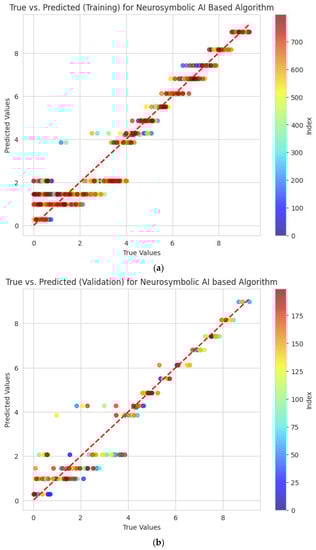 We also employed the coefficient of determination, or R-squared (R2), to determine the proportion of variance in the dependent variable that could be predicted from the independent variables. R2 values are on a scale from 0 to 1, where 1 signifies an ideal fit. The neurosymbolic algorithm outperformed with R2 values of 0.9379 and 0.9141 for training and validation, respectively, in comparison to the simple ANN’s R2 values of 0.8667 and 0.8405. The higher R2 values indicate a superior predictive accuracy and model performance by the neurosymbolic algorithm.