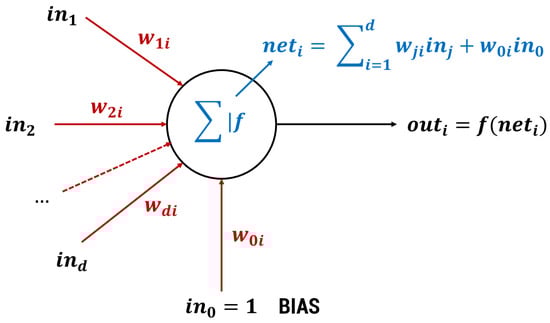 Each neuron has several inputs which can be either the input signals of the problem or signals deriving from previous neurons. The different inputs are added together in relation to the weightof their connections. In the training phase of the neural network, these weights are used to improve the learning of the network. The neuron is also characterized by a bias. It can be seen as a weight connected to a dummy input equal to unity that has the task of calibrating the neuron’s optimal working point. Another fundamental feature of the elementary unit is the activation function that defines the output of the neuron itself (Figure 1). In particular, this function shapes the output of the neuron related to its internal potential, which is determined by the inputs, the weights of the connections, and the bias.