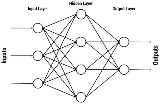 In the literature, it is possible to find different configurations of neural networks []. Having analyzed the nature of the problem under examination, in which the value to be predicted is not temporally correlated to the others (each series of KPIs identifies a different tire that corresponds to a different wear level), the NN with the simplest architecture, the feed-forward, has been chosen. Feed-forward Neural Networks are structures in which connections link neurons of a certain level only with neurons of a subsequent level. So, backward connections or connections between neurons of the same level are not allowed in these networks (Figure 3). Feed-forward networks do not have memory about what occurred at previous times, so the output is determined only by the current inputs. These kinds of networks are the foundation for computer vision, natural language processing, and other work, such as making predictions concerning the future course of a quantity.