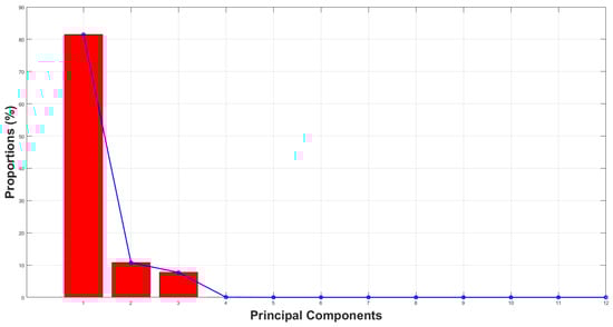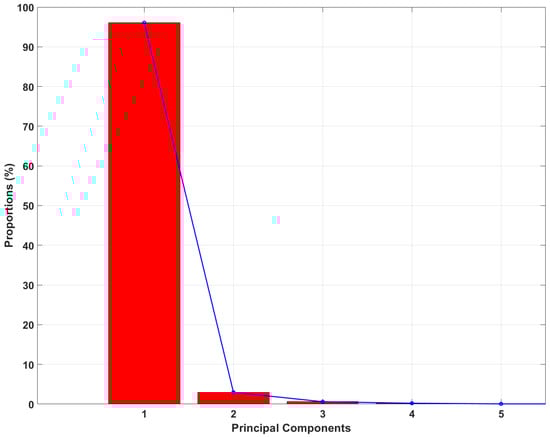 The general hope of principal components analysis is that the first few components will account for a substantial proportion of the variation in the original variables and can, consequently, be used to provide a convenient lower-dimensional summary of these variables that might prove useful for a variety of reasons. The first principal component of the observations is that linear combination of the original variables whose sample variance is greatest amongst all possible such linear combinations (Equation (3)). The second principal component is defined as that linear combination of the original variables that accounts for a maximal proportion of the remaining variance subject to being uncorrelated with the first principal component. Subsequent components are defined similarly.