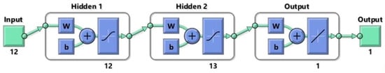 The first approach has been the use of an artificial neural network (ANN); it is a set of simple units, called neurons, which communicate with each other by sending signals through connections and which are often organized in different layers according to need. In most cases, an artificial neural network is an adaptive system that changes its structure based on information flowing through the network itself during the training or learning phase []. They can be used to simulate complex relationships between inputs and outputs that other analytic functions cannot represent. Moreover, neural networks, through learning cycles (input–processing–output) more or less numerous, are able to generalize and provide correct outputs associated with inputs that are not part of the dataset with which the network is trained []. To make a neural network work correctly, it is necessary to carry out an initial training phase; to do this, there are several training algorithms that meet specific needs and purposes. In the case of supervised learning, the network is provided with a set of inputs to which known outputs correspond. By analyzing them, the network learns the link that unites them. In this way it learns to generalize, that is, to calculate new correct input–output associations by processing inputs external to the main dataset used for the learning phase and without knowing the outputs. In this way, it is possible to predict certain results by knowing the main quantities on which they depend.