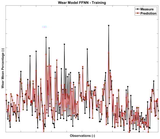Thanks to this preliminary physical correlation, it has been possible to select six inputs in order to build two regression models for front and rear tires. The six inputs are reported in Table 10 and the rear tire regression model shows interesting results for both the training and validation phase (Figure 15).