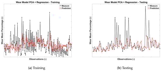 In this work, mainly three strategies have been analyzed and subsequently implemented, with a progressive increase in the data pre-processing phase: the implementation of feed-forward neural networks [], the reduction in the dimensionality of the database through a feature selection carried out with the principal component analysis [] coupled with the development of linear multiple regression, and finally, the implementation of a linear multiple regression based on the combination of different linear correlations based on the physical nature of the data. Despite the obvious simplification of the problem under examination, these approaches have been chosen with the intention of developing simple models capable of providing greater information on wear levels in scenarios not yet explored from an experimental point of view. The reliability of the different approaches proposed was evaluated through a series of statistical indicators [] and by applying the different models to an additional testing database not used in the training phase, confirming the improved robustness of the last methodology to be presented.
