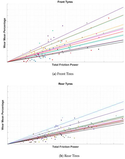 First of all, considering the information provided, it was realized that in several cases, the front wheels show phenomena of irregular wear, which are difficult to quantify using KPIs. In addition, due to the steering dynamics, the front tires were subject to comparable friction power with each other, but not with the rear tires; for these reasons, two separate investigations were conducted, one for the tires of the front axle, the other for the rear. The dependence between mean wear and friction power was then analyzed, considering the accumulated energy dissipated in the entire run. Starting from the Mean Wear Percentage vs. Total Friction Power plot, an interpolating line has been defined for each circuit (Figure 12).