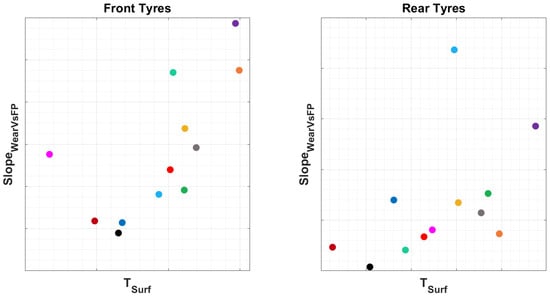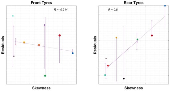 Thanks to this procedure, a good correlation has been found with the surface average temperature (Figure 13) and, subsequently, it was noticed that residuals show good correlations with road skewness, but only for rear tires (Figure 14). As already mentioned, this means that for the front tires, the wear is also influenced by further phenomena, such as graining or blistering.
