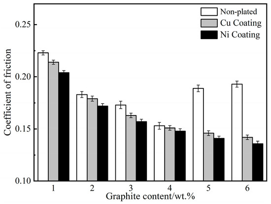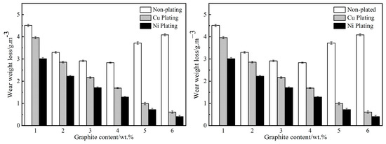 The coefficient of friction for each test was obtained by recording the coefficient of friction of the wear testing machine at 30 ms intervals and calculating the average value. In order to enhance the reliability of the test, the experiment was repeated 8 times for each group of samples. Figure 3 displays the test results. The figure indicates that the coefficient of friction of the Cu-based self-lubricating materials prepared by Cu and Ni plating on the graphite powder surface gradually decreases with the increase in the graphite content. The material containing 6 wt.% graphite content demonstrated the lowest coefficient of friction. The minimum coefficient of friction of the Cu-plated material was 0.142, while that of the Ni-plated material was 0.136. The coefficient of friction of Ni- or Cu-plated materials were reduced 11.1% and 7.2%, respectively. Compared with the materials lacking graphite powder, the coefficient of friction of the materials slowly increased when the graphite content exceeded 4 wt.%. Graphite forms a network structure that splits the matrix, and the matrix spalling off in the wear process causes an increase in the coefficient of friction. The bonding strength between carbon and Cu improves after Cu and Ni plating on the graphite powder surface. When the graphite content exceeds 4 wt.%, the bonding strength of the graphite and matrix strengthens. As a result, spalling of the material’s matrix does not occur. When subjected to the same graphite content, the coefficient of friction of the materials prepared by Cu- and Ni-plating graphite powders were compared, and the Ni-plated materials demonstrated a lower coefficient of friction than the Cu-plated materials.