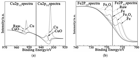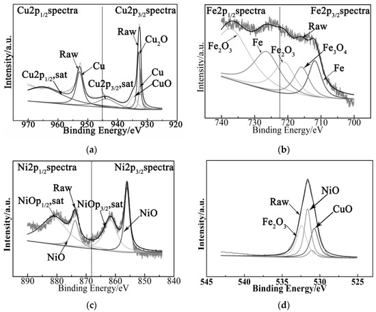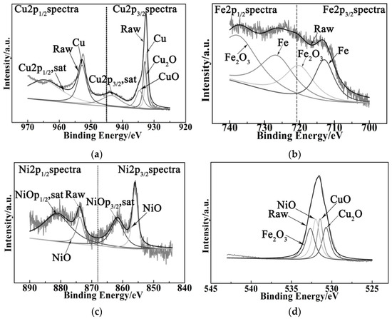 XPS results of N6 sample. (a) Cu element; (b) Fe element; (c) Ni element; (d) O element.