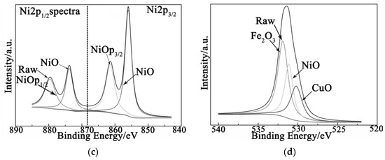 XPS results of C6 sample. (a) Cu element; (b) Fe element; (c) Ni element; (d) O element.