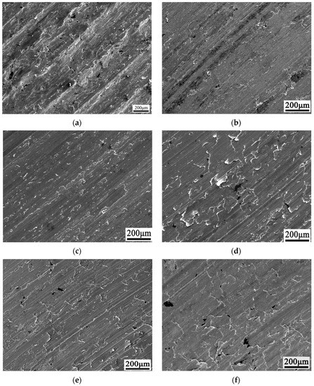 SEM analysis of worn surfaces. (a) O2 sample; (b) O4 sample; (c) C2 sample; (d) C4 sample; (e) N2 sample; (f) N4 sample.
