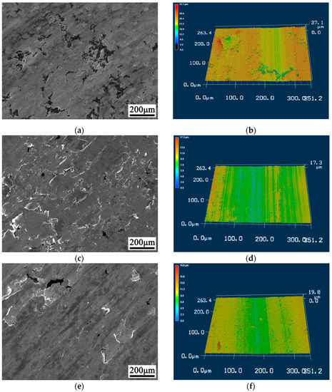 The wear surface morphology of the O6, C6, and N6 disk samples was analysed using SEM, as shown in Figure 9. Figure 9a displays the wear surface morphology of the O6 disk samples, revealing numerous spalling pits on the surface. This is due to the graphite forming a cutting network that causes the matrix to spall. As a result, the lubrication film is unable to cover the wear surface effectively. Figure 9c shows the wear surface morphology of the C6 disk samples. The analysis revealed no visible spalling pits on the surface, and the surface is complete. However, the fatigue failure is severe. Therefore, Cu plating on the graphite surface reduces the coefficient of friction and wear weight loss of the materials to a certain extent. Figure 9e illustrates the wear surface morphology of the N6 disk samples. The analysis shows that the surface is fairly complete, with less fatigue failure and no spalling pits. Thus, the coefficient of friction and wear weight loss of N6 were the lowest, demonstrating that Ni-plated graphite improves the friction and wear performance of the materials compared to the Cu-plated samples. The surfaces of the disk samples labelled O6, C6, and N6 were analysed through 3D laser topography to assess their wear and roughness. The outcome of this analysis is illustrated in Figure 9b,d,f. The wear surface of disk sample O6 has several spalling pits, which resulted in a roughness of the wear surface of roughly 4.45 μm; this roughness was responsible for an increase in the coefficient of friction of the O6 disk. In comparison, through the 3D laser morphology of the wear surface of disk C6 in Figure 9d, we can conclude that the wear surface of disk C6 is flat, with shallow furrows and a roughness of roughly 1.5 μm, leading to a lower coefficient of friction than that of disk O6. The 3D laser morphology of the wear surface of disk N6 in Figure 9f shows that the wear surface is flat, has slight micro-cutting, and has a roughness of about 1.01 μm. Therefore, the coefficient of friction of N6 is the lowest. This analysis demonstrates that the Ni and Cu plating on the graphite powder surface can effectively reduce the roughness of the wear surface, and that the effect of Ni plating is better than Cu plating.