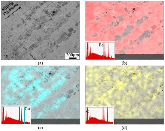 The surface of the pin sample that was ground using the O6 disk sample underwent both SEM and EDS analysis, with the results presented in Figure 10. The figure shows adhesion of the wear surface of the O6 pin specimen to both the matrix and graphite of the disc specimen. Additionally, it was observed that mass transfer occurred between the matrix and graphite during the wear test. Notably, the amount of graphite mass transfer was limited, and the area covered on the wear surface of the pin was small. Further, the mass transfer of the matrix was significantly greater than that of graphite, indicating that the adhesion of the matrix is better than that of graphite. The analysis in Figure 10 reveals that the area of overlap between the graphite mass transfer region and the matrix mass transfer region is small. The low bonding strength between the graphite and the matrix interface results in the separation of mass transfer between the two materials during the grinding process of the disk sample and the pin sample, which is why the mass transfer areas do not coincide. Additionally, the disk wear surface’s abundant matrix spalling results in a considerable amount of exposed graphite. In turn, this leads to insufficient coverage of the bare matrix and graphite by the lubrication film that forms on the disk surface. Thus, the matrix and graphite mass transfers do not occur in the same area. Consequently, the wear pairing between the pin and disk leaves behind U75V anti-grinding Cu-based self-lubricating material, which explains the high coefficient of friction and wear rate of the O6 sample.