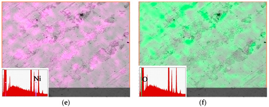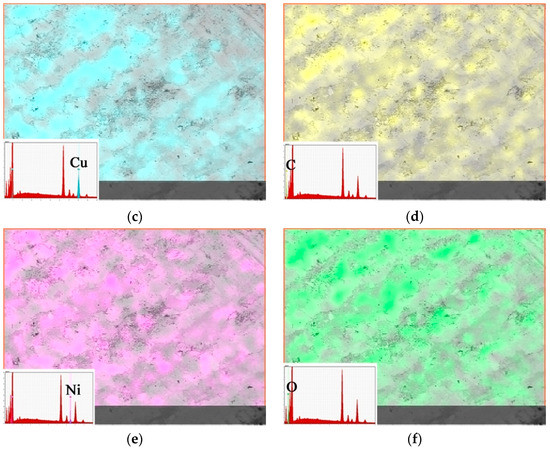 SEM and EDS analysis of C6 pins. (a) SEM image; (b) EDS mapping of Fe element; (c) Cu element; (d) C element; (e) Ni element; (f) O element.